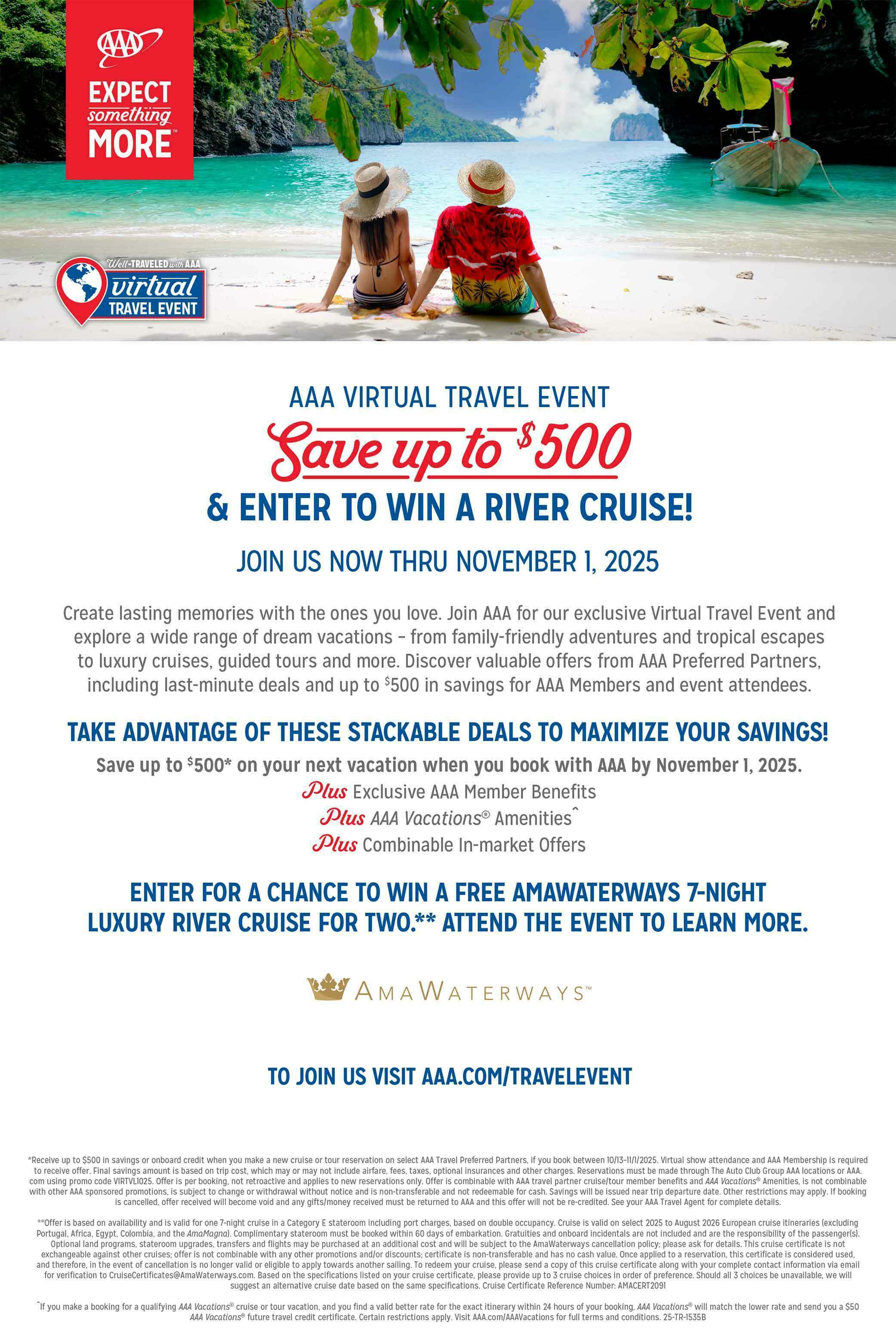 AAA Virtual Travel Event Offer Valid: 10/23/2025 - 11/01/2025 Save Up to $500 AAA Travel and Insurance AAA Travel and Insurance 3905 Twin Creek Dr Ste 107 Bellevue NE 68123 (402) 938-0079 Send Email Visit Website This Hot Deal is promoted by Bellevue Chamber of Commerce & Community. Share × Print Email Facebook Twitter LinkedIn Pinterest Tell a Friend ×